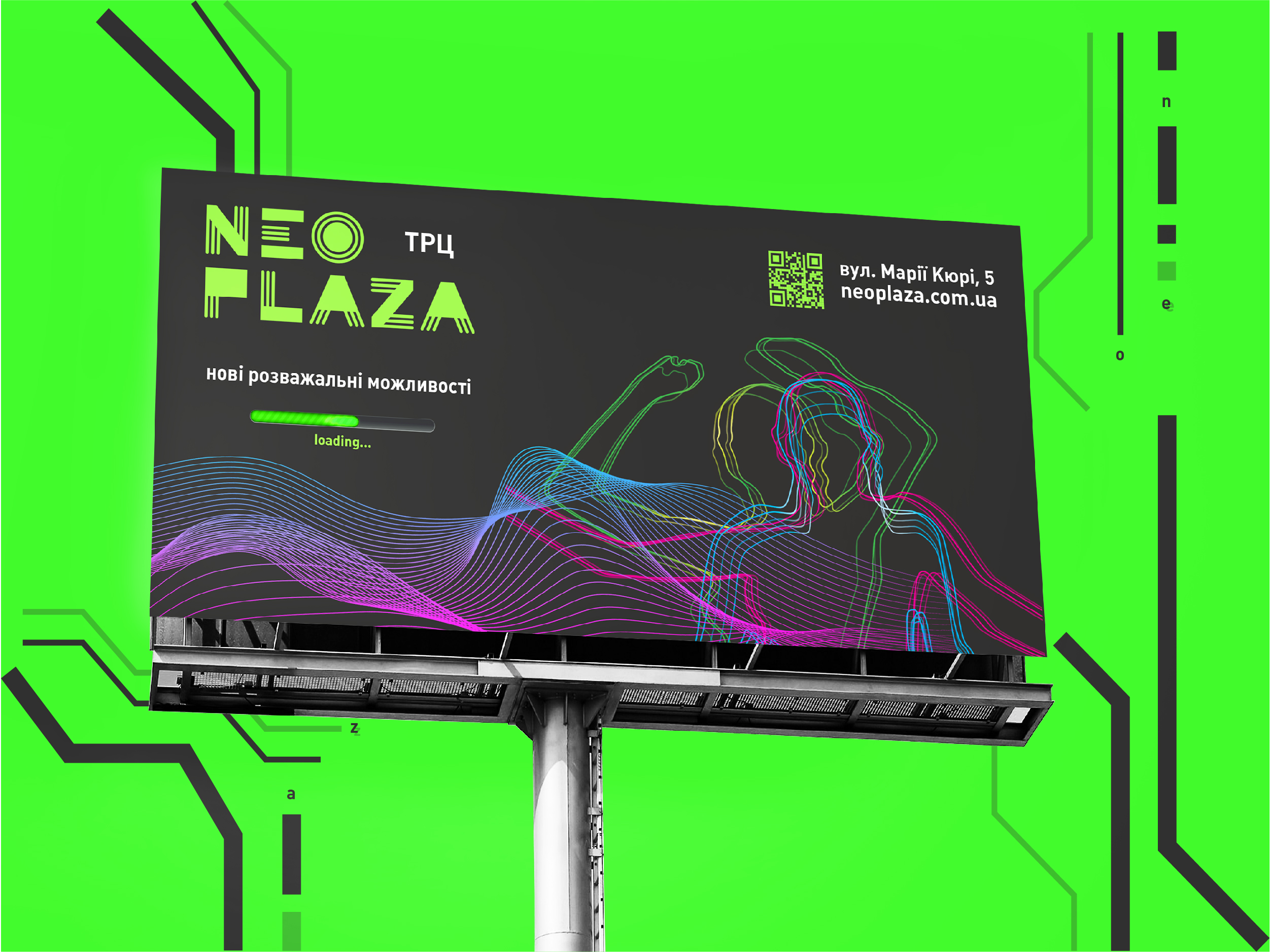 В логотипе и фирменном стиле — неоновые оттенки, ядовитый зеленый и цвет фуксии, радужные расцветки и контрастные линии. Уникальные стилеобразующие элементы напоминают не то эскалаторы, не то направления входов и выходов, не то соединение оптоволоконных кабелей, опоясывающих наш мир как в фильме «Матрица». В этом же стиле выполнена и внутренняя навигация торгово-развлекательрного центра. Мы создали новую концепцию, добавили характер.